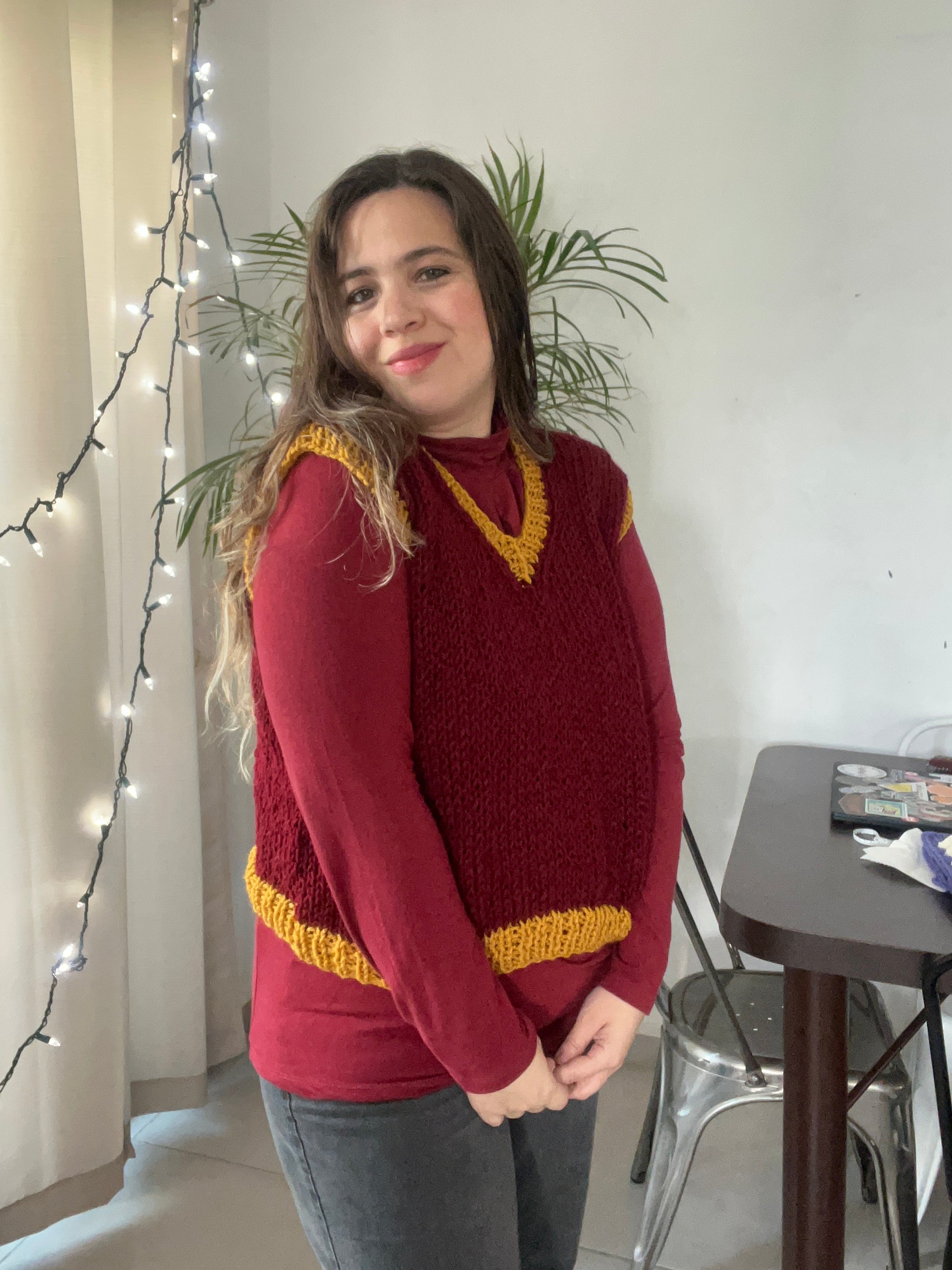 Se teje con dos agujas, con una estructura clásica y cuello en V.
