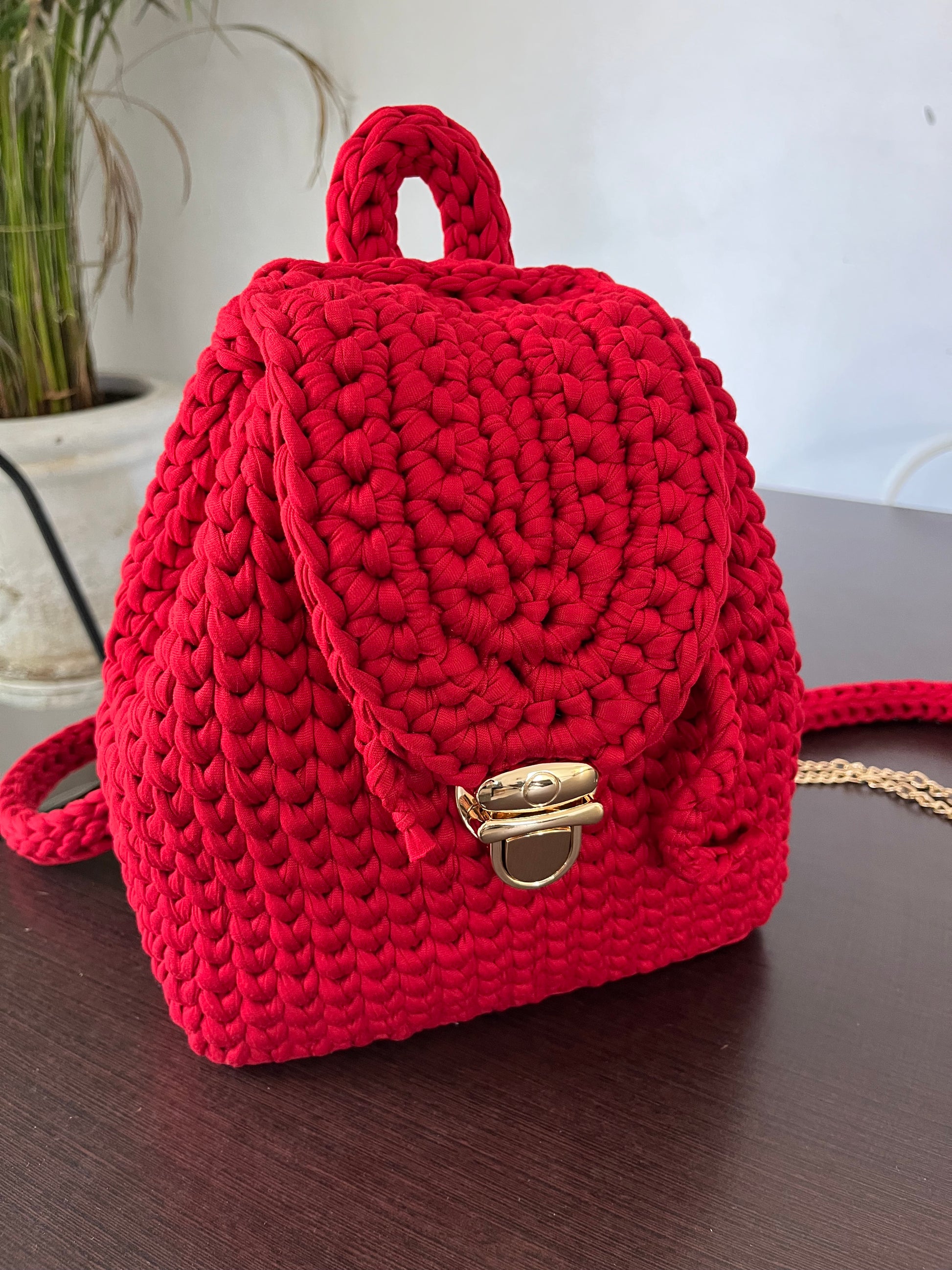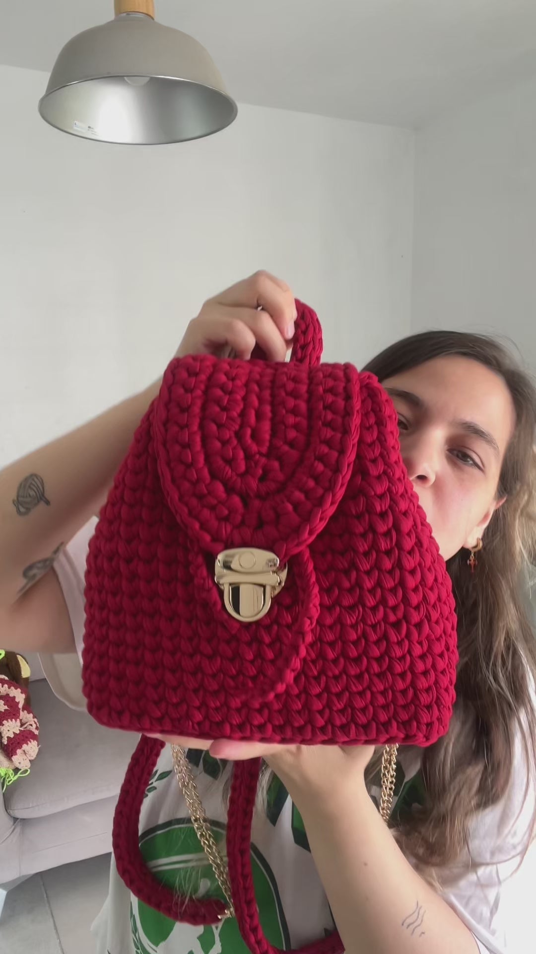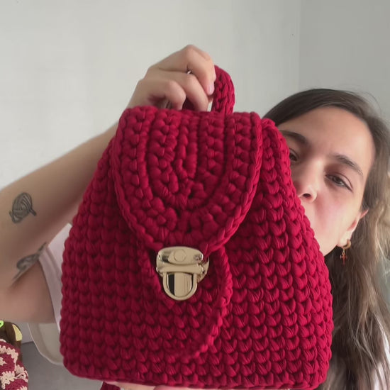 Esto no es un producto físico. Es un taller (clase) en video, para aprender a tejer esta mochila con trapillo.